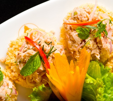 ประเภทอาหาร หมี่กล้องราดหน้า , สเต็กปลา , ข้าวตังทูน่าสลัด |