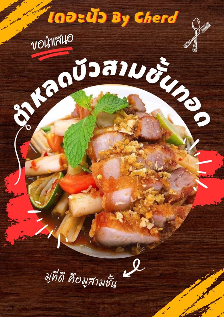 ประเภทอาหาร ตำหลดบัวสามชั้นทอด สามชั้นทอด เมี่ยงสามชั้นทอด ไก่เทวดา ลาบไก่ทอด |